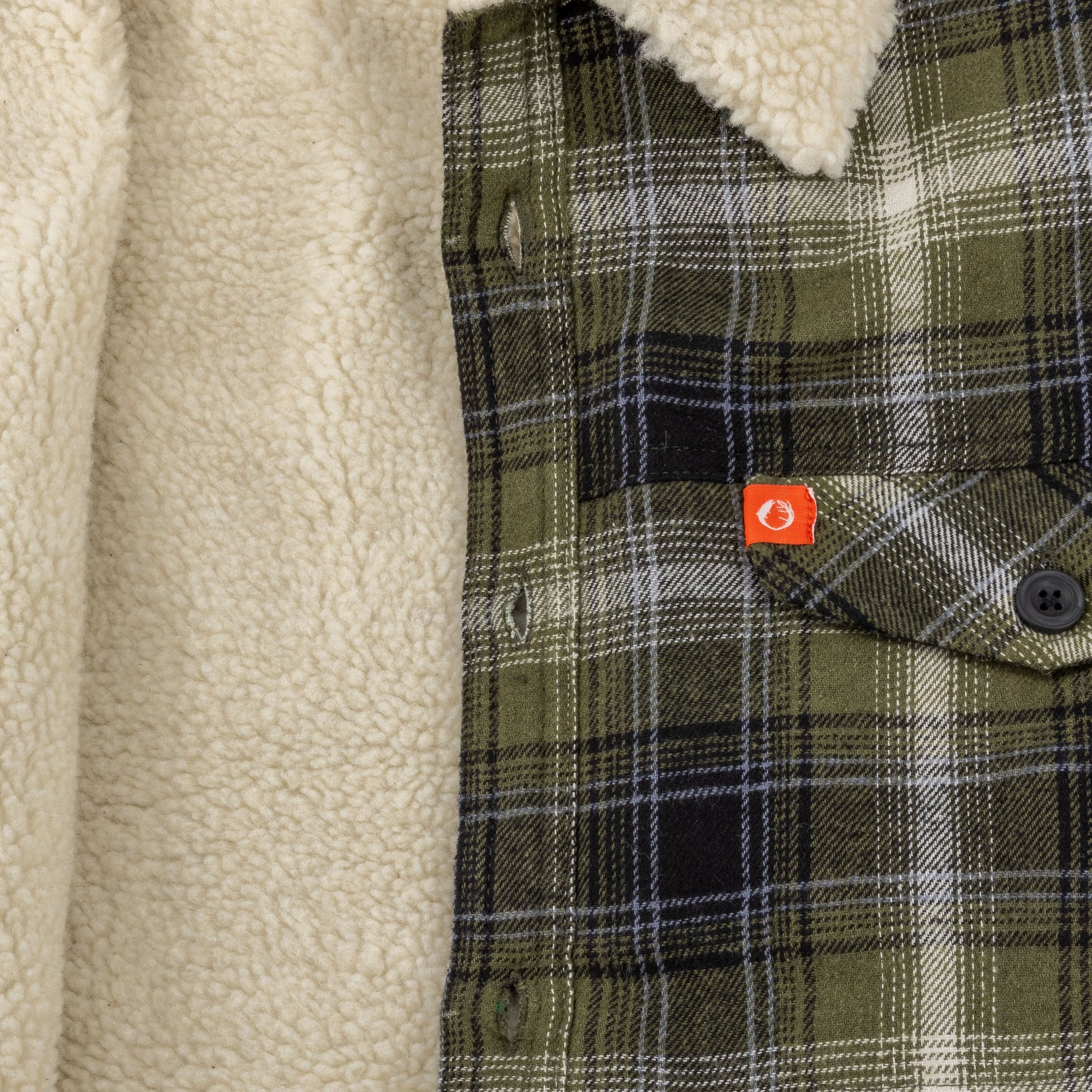 - MATERIAL: Brushed yarn-dyed flannel 100% cotton with 100% polyester Sherpa fleece lining on the torso, and quilted lining on the sleeves.